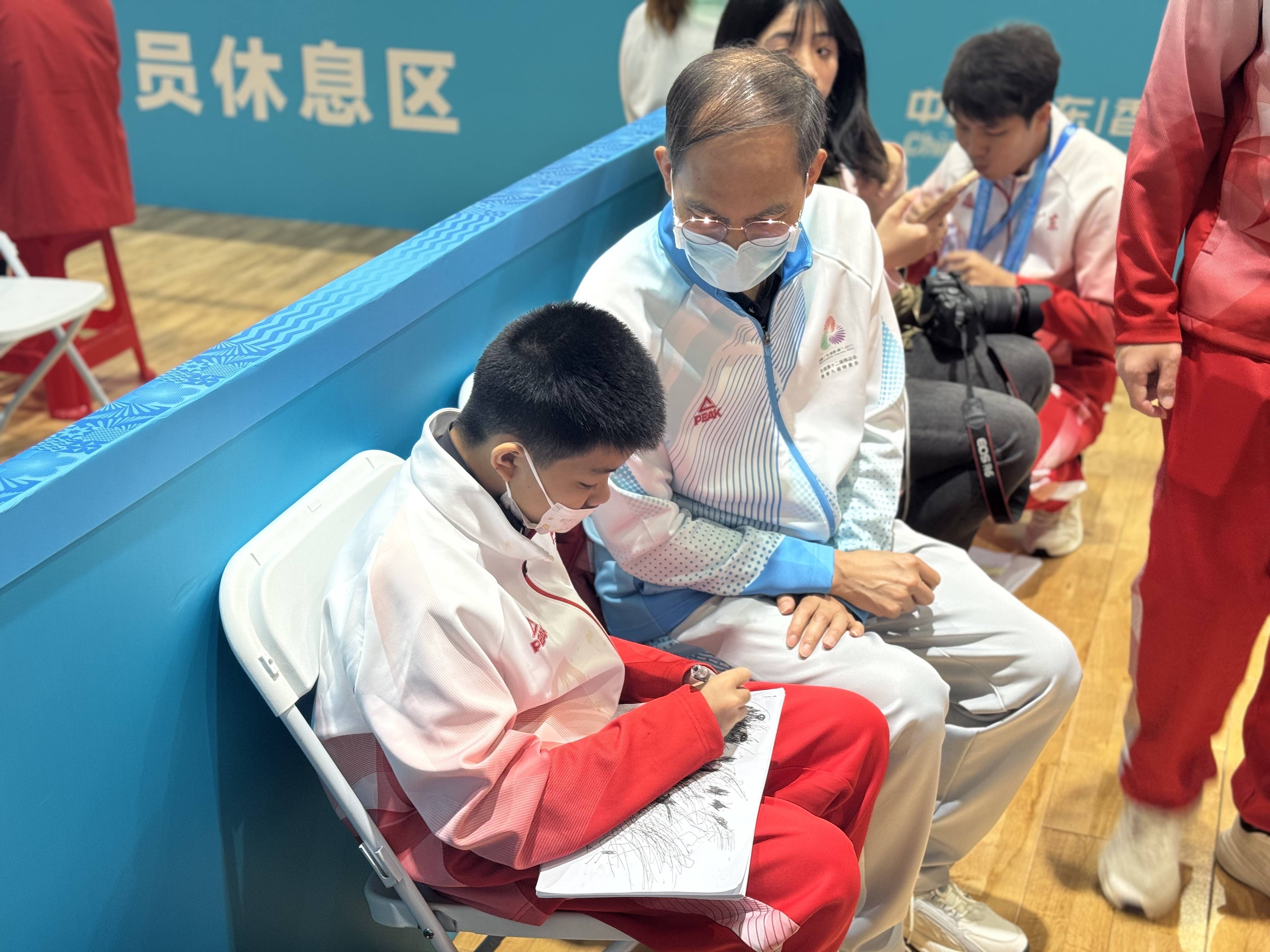 校长黎立民(左二)在比赛间隙陪伴队员画画。新华社记者 杨博毅 摄比赛间隙,几名运动员拿起画本,在场边安静涂抹。有的孩子画出爱心和苹果,有的则是交错的线条和方块……校长黎立民偶尔坐到一旁,在看似杂乱的线条旁画一个圆、添一条尾巴,一只小动物跃然纸上。