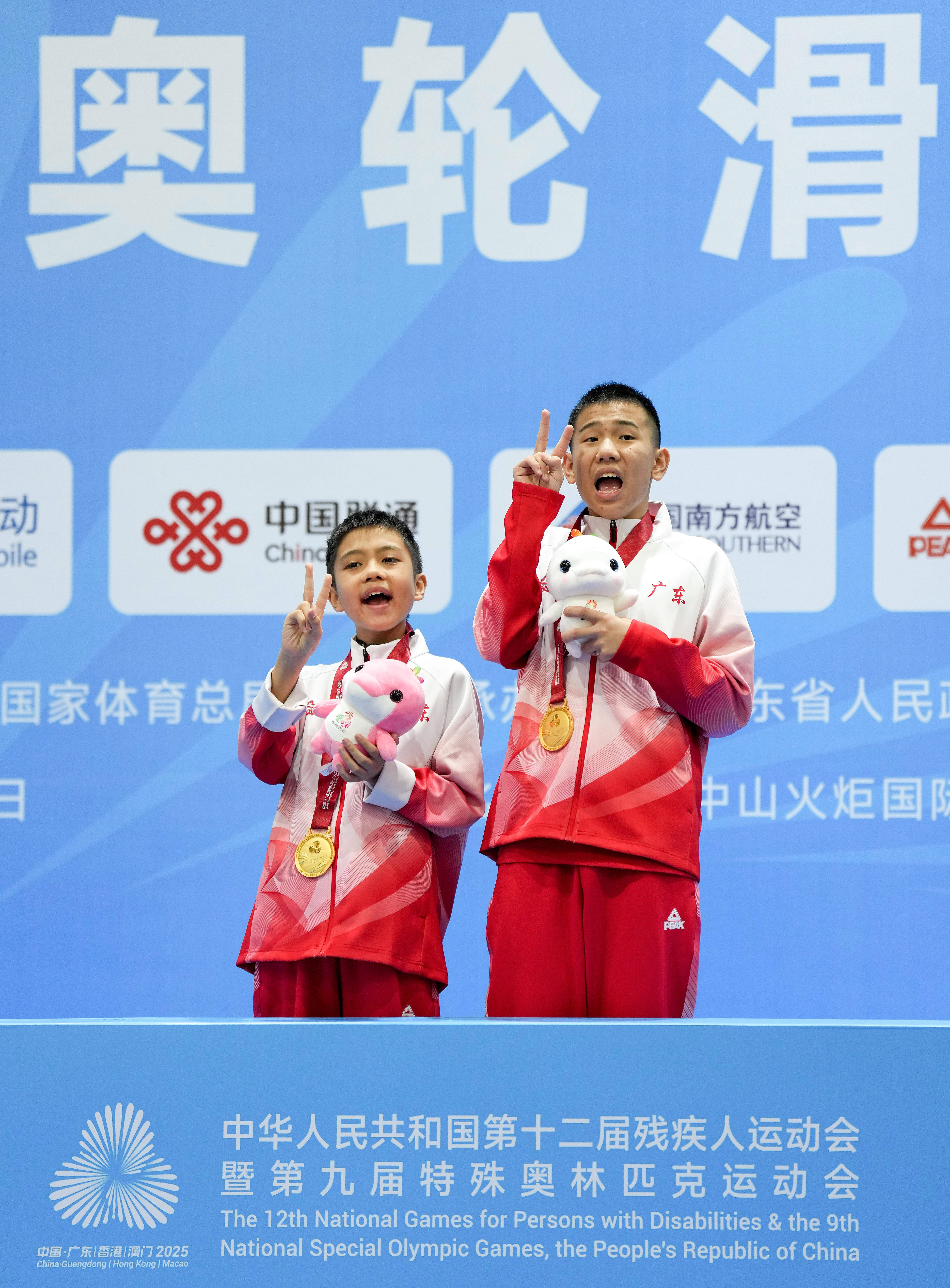 12月11日,广东一团队选手许腾(右)和队友张峻在颁奖仪式上合影。他们夺得全国第十二届残疾人运动会暨第九届特殊奥林匹克运动会特奥轮滑项目男子组2x100米接力M05组冠军。新华社记者 马金瑞 摄李启智和他的队员都来自佛山市康复实验学校。这所学校的学生多是孤独症、重度脑瘫或智力障碍的儿童。本次赛事中,学校共派出5名学生、3名老师参加轮滑项目比赛。穿护具、戴头盔、系鞋带……这些赛前的准备事项,对孩子们而言,需要反复练习才能完成。